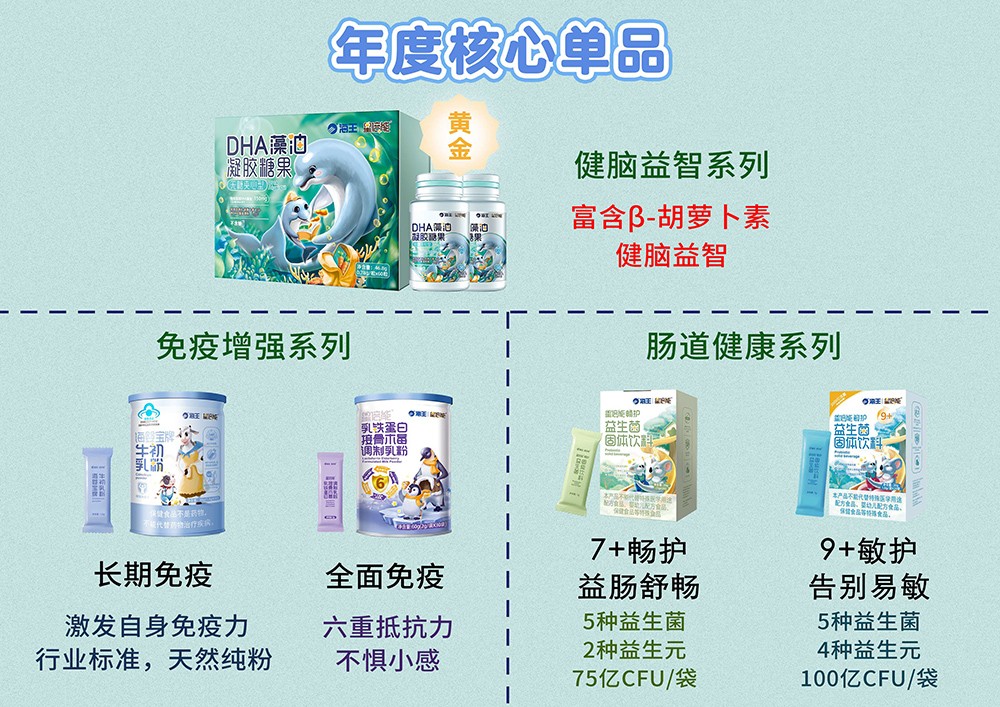 品牌名稱:海王星倍能 主營產品:海王星倍能藍帽軟膠囊,DHA,益生菌,乳鐵蛋白,鈣鐵鋅 品牌特色:海王星倍能嬰童營養(yǎng)保健品