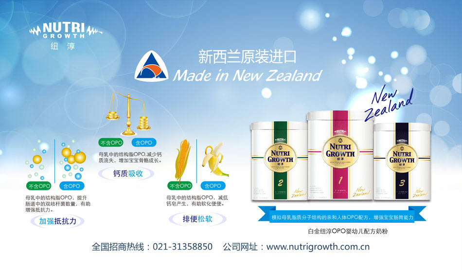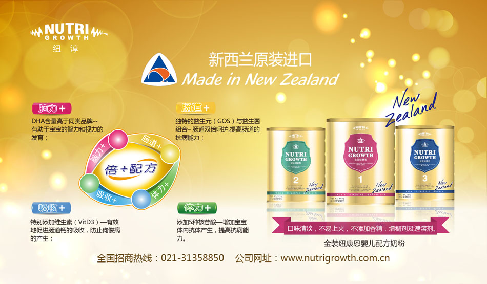 為使中國寶寶也能享受到NUTRI GROWTH NEW ZEALAND LIMITD(紐淳)的關(guān)愛,2008年NUTRI GROWTH 正式進(jìn)軍中國市場(chǎng),2009年金裝“紐康恩”嬰幼兒配方奶粉全線上市。