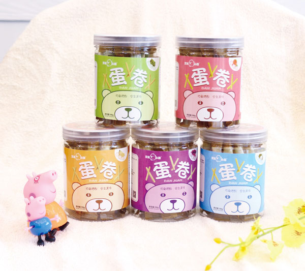 艾比小熊蛋卷系列共包含5種口味,紫薯、椰奶、香蕉、海苔、草莓;精選面粉,含礦物質(zhì)、無機(jī)鹽、蛋白質(zhì),加入雞蛋液、各種果蔬汁、奶汁、海苔碎片等,經(jīng)成糊、成卷、涂抹植物油烤焙而得,蛋卷色澤金黃偏向其中所加