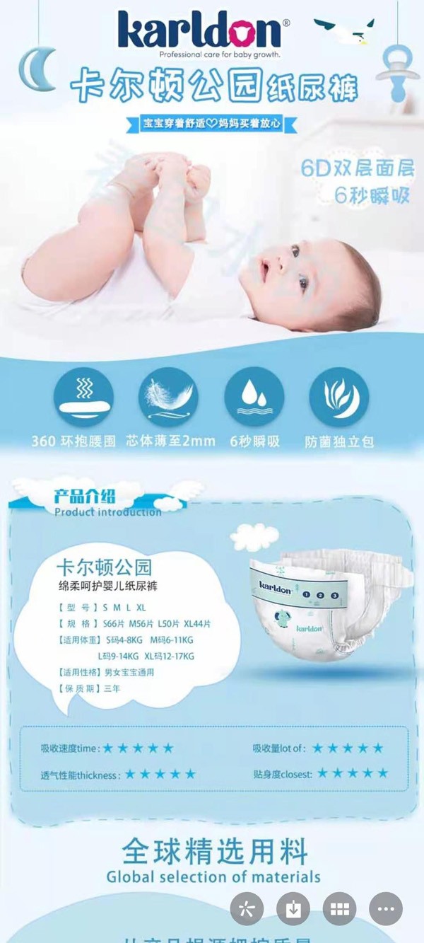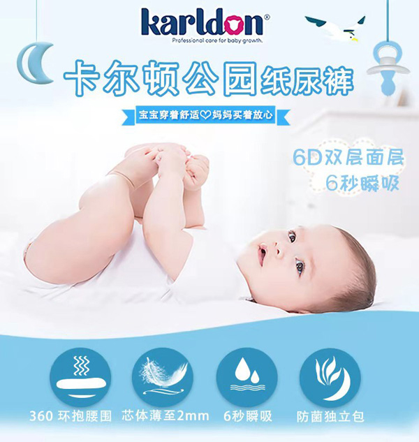 卡爾頓公園紙尿褲,專為長時間使用而設(shè)計,能持久保持寶寶小屁屁干爽,透氣加倍,遠離紅屁屁!快速6秒瞬吸鎖水,超薄柔軟,百分百全住友吸水因子,當(dāng)然更“靠譜”!6D復(fù)合技術(shù),隱藏式導(dǎo)流凹槽工藝,上億個微孔透氣,崗雙加倍,舒適加倍!同時更采用人體工程學(xué)設(shè)計,貼合小屁屁,減少腿部摩擦,穿脫建議,寶寶喜歡,媽媽省心!