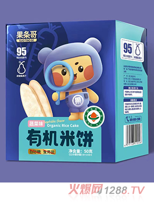 果條哥有機米餅,有水果味、蔬菜味、原味共三種口味,精選原料,有機大米含量達95%,添加濃縮梨清汁,不添加白砂糖、食用鹽,味道清甜,蓬松酥脆,入口易溶,健康美味,好吃易消化。