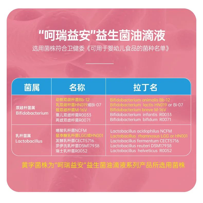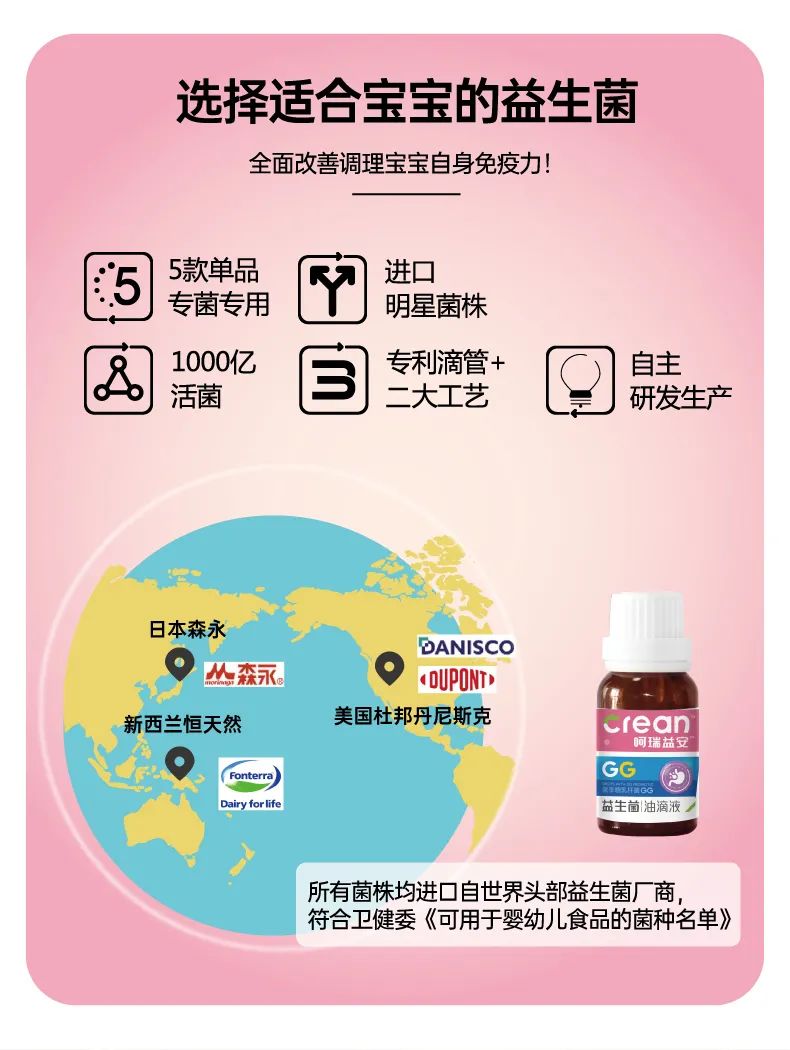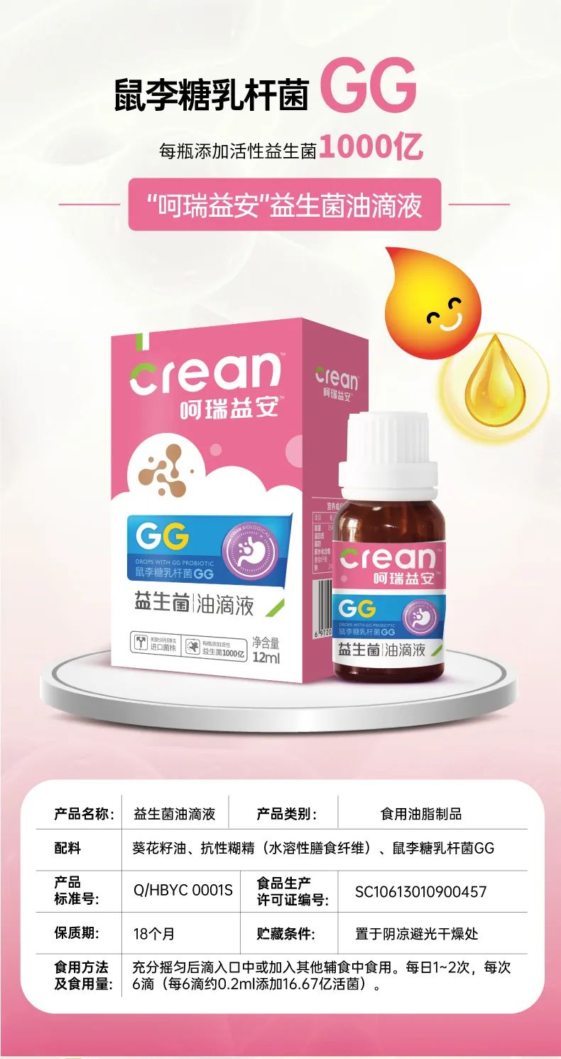 呵瑞益安鼠李糖乳桿菌GG益生菌油滴液,采用進口菌株,且選用菌株符合衛(wèi)健委【可用于嬰幼兒食品的菌種名單】。添加進口原料,如瑞典AAK進口油脂及進口水溶性膳食纖維,安全配方,自主研發(fā)生產,每瓶添加1000億活性益生菌,專利滴管,精準控量,油滴嵌入包裹工藝+全程充氮;罟に嚕卫捂i定活性。