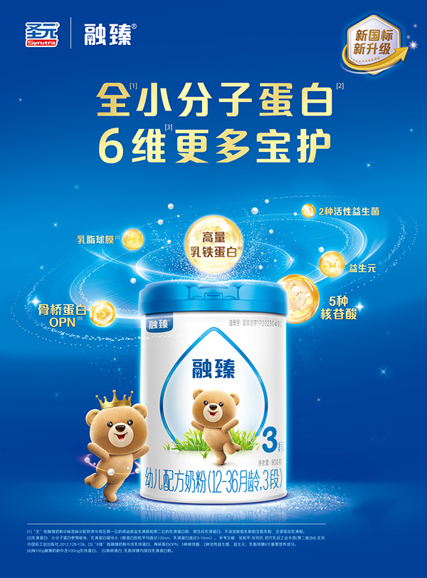 圣元融臻新國標(biāo)奶粉采用的是全乳清蛋白配方,乳清蛋白的含量高達(dá)90%以上,乳酪比9:1,與初乳蛋白的比例保持一致,好消化,易吸收!針對(duì)寶寶生長發(fā)育的需求,特別添加了6維寶護(hù)因子,每100g添加乳鐵蛋白100mg、益生元3100mg、50mg的5種核苷酸;另外還添加了2種活性益生菌,乳脂球膜以及骨橋蛋白OPN,6重保護(hù)因子,助力寶寶擁有超強(qiáng)的自護(hù)力。