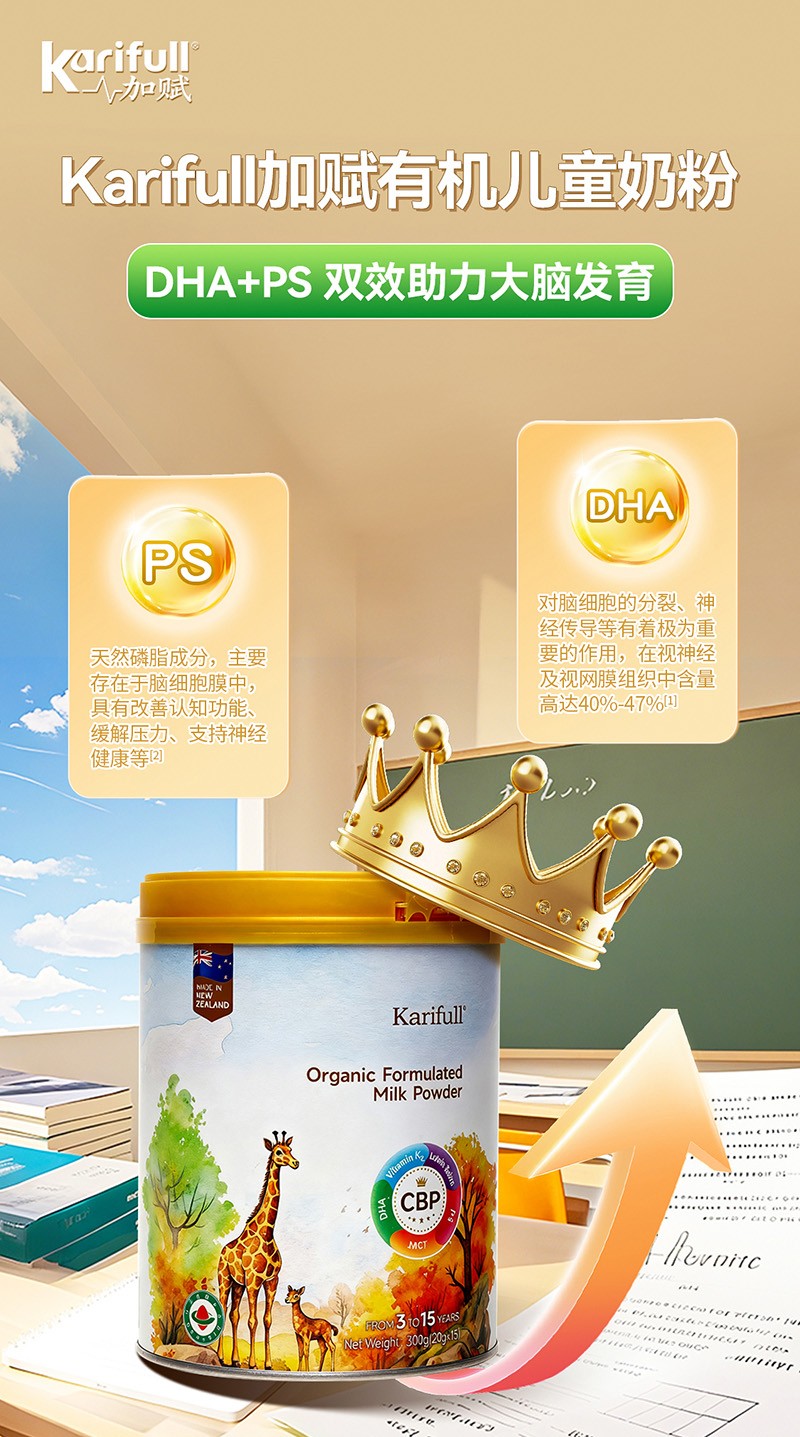加賦有機奶粉,三大產能營養(yǎng)素含量較高,滿足3-15歲兒童成長所需的基礎要求,PS 180mg,初乳堿性蛋白200mg,葉黃素脂10mg等其他的維生素礦物質,補充腦力,視力,骨骼力,免疫力等其他需要