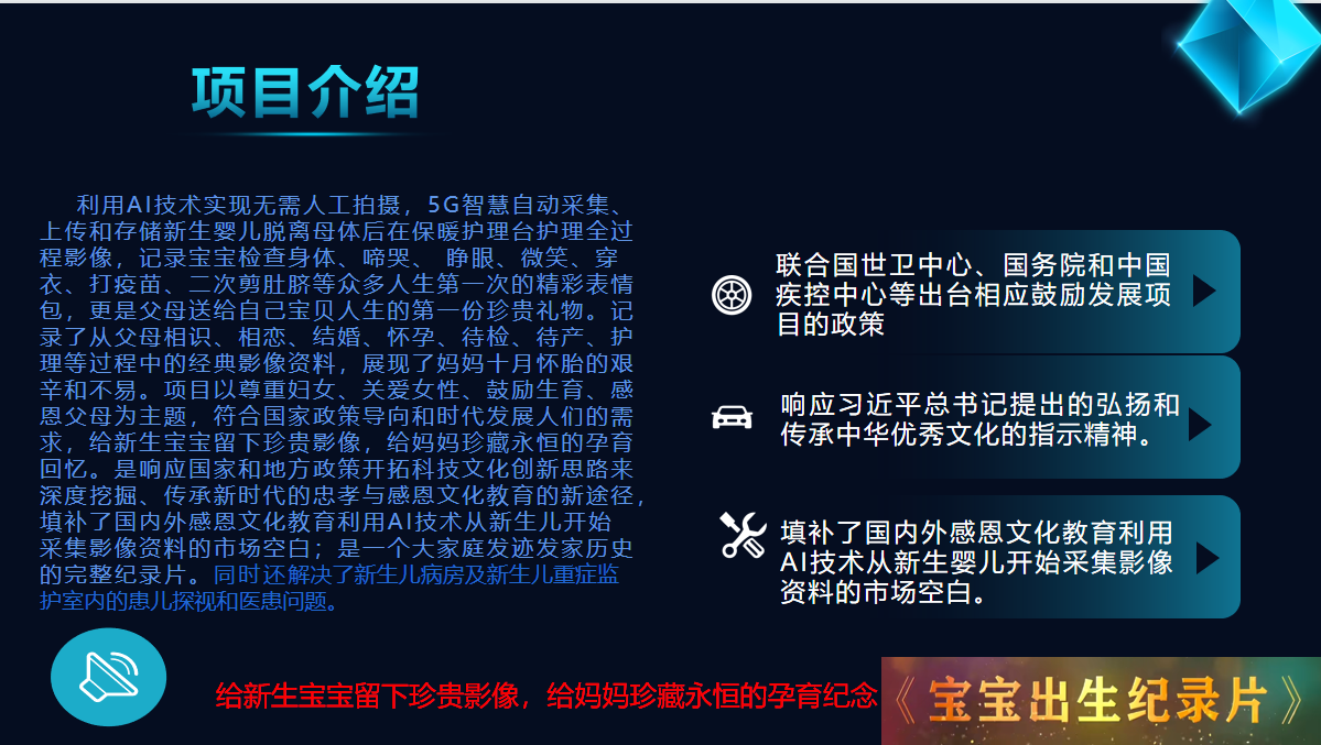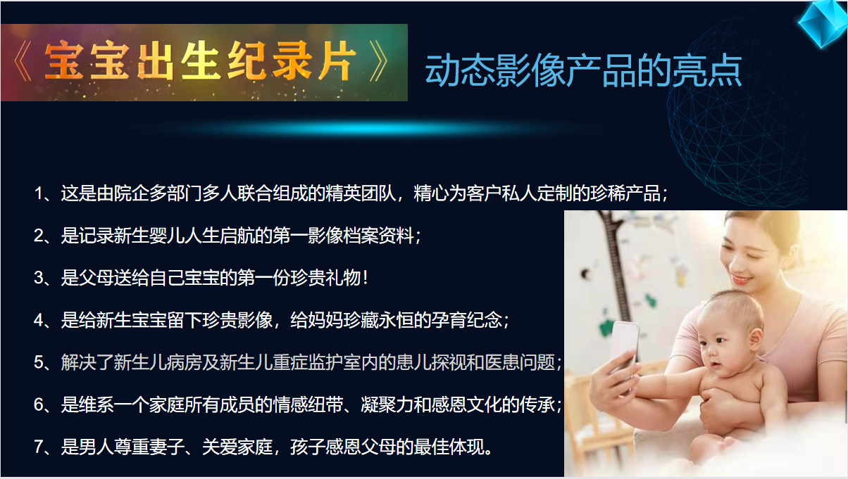 利用國家相關(guān)政策的支持,與婦幼婦產(chǎn)醫(yī)院合作,以AI技術(shù)自主研發(fā)的專利產(chǎn)品實現(xiàn)5G智慧采集新生兒影像資料,制作一部具有珍藏?zé)o價、永恒留戀、尊重婦女、關(guān)愛女性、鼓勵生育、感恩父母的動態(tài)影像——《寶寶出生紀(jì)錄片》。