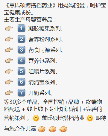 主要生產(chǎn)母嬰營養(yǎng)品︰凝膠糖果系列、營養(yǎng)粉劑系列、藥食同源系列、營養(yǎng)包系列、咀嚼片系列、清清寶系列、開奶系列等30多個(gè)單品。全國控銷+品牌+終端物料配送+線上線下專業(yè)知識培訓(xùn)+完善的營銷策劃,蕙氏碩博搭檔藥業(yè),期待與您合作共贏。