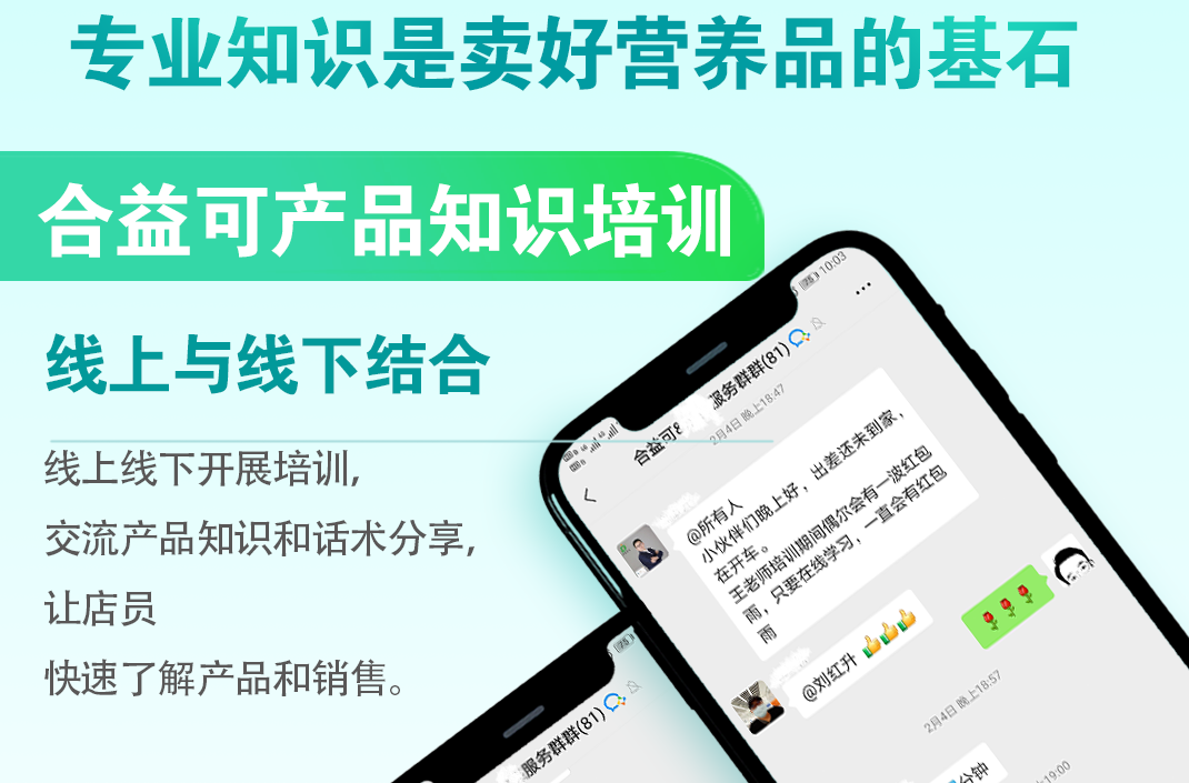 作為一個專業(yè)營養(yǎng)品品牌,深知專業(yè)性對家庭健康的重要性,更是門店營養(yǎng)品銷售的核心,門店與客戶信任與忠誠的紐帶,再好的營養(yǎng)品,離不開專業(yè)的服務(wù),合益可商學(xué)院應(yīng)運而生——提升合作門店專業(yè)度。通過線上線下知識培訓(xùn)的開展,讓合作門店從最初的產(chǎn)品認(rèn)知到相關(guān)營養(yǎng)品知識學(xué)習(xí),從單一產(chǎn)品的專業(yè)知識到母嬰護(hù)理全面營養(yǎng)知識學(xué)習(xí)。