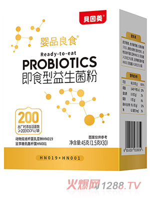 貝因美嬰品良食即食型益生菌粉凈含量 45 克,內(nèi)含 1.5 克 ×30 袋,攜帶方便。每袋出廠時(shí)添加活菌數(shù)≥200 億 CFU,充足的活菌數(shù)量為腸道活力提供保障。特別添加動(dòng)物雙歧桿菌乳亞種 HN019 與鼠李糖乳酪桿菌 HN001,兩種優(yōu)質(zhì)菌種科學(xué)配比,助力維護(hù)腸道微生態(tài)平衡。