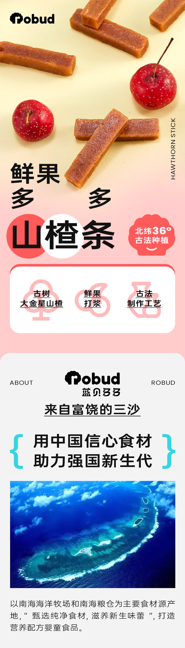 藍貝多多鮮果多多山楂條甄選古樹大金星山楂,鮮果打漿,酸甜適中,古法制作工藝,有原味、六物味、桑葚味三種不同的口味單品,配料僅山楂、白砂糖、水,不添加香精、色素、防腐劑,質地軟糯,不傷乳牙,含豐富維生素C和天然果膠、果酸,備受小朋友們的喜愛。
